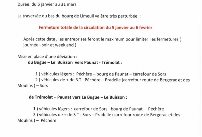 Travaux dans le bas du bourg de Limeuil du 05 janvier au 31 mars 2026
